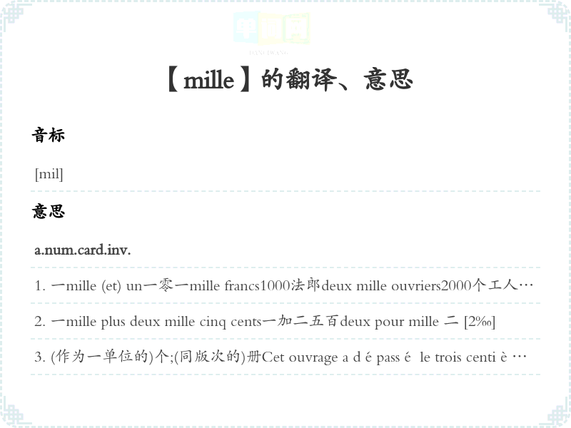 一mille (et) un一零一mille francs1000法郎deux mille ouvriers2000个工人le monde de l'an deux mille 2000年时的世界[指年份时, 亦可用 mil]l'an mil neuf cent soixante-douze公元1972年— a.num.ord.inv.第一page mille 第1000页le numéro deux mille 第 2000 号— a.inv.许多的, 无的courir mille dangers冒许多危险mille mercis万感谢(tapisserie à) mille fleurs (15世纪时)在深绿色枝叶的背景上配有各种花朵的挂毯Je vous le donne en mille .一次也不到。— n.m.inv.