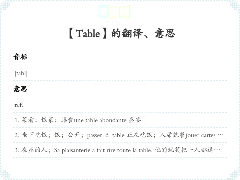 表; 餐;table à rallonges 可以加长的餐propos de table 席间闲谈,餐漫谈table alphabétique 字母表table des matières 目录