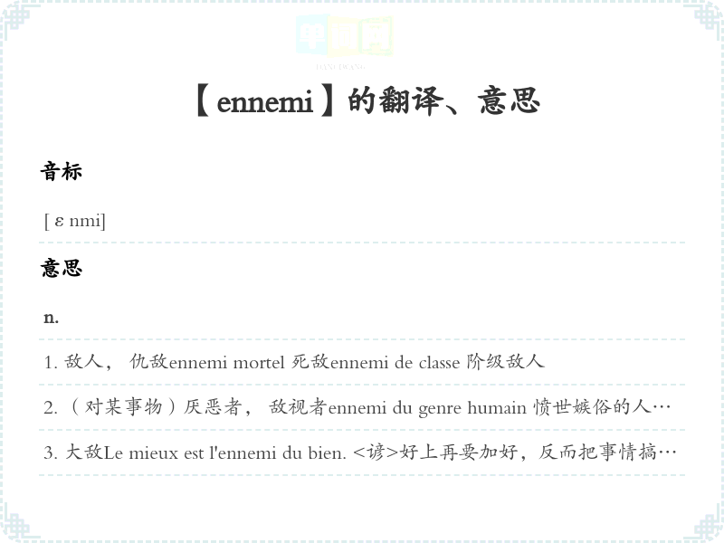 【ennemi】 词:、 联想:、 近义词:、 反义词: 联想词