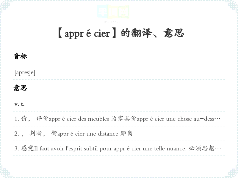 【apprécier】 助记:、 词根:、 派生:、 联想:、 名词变化:、 近义词:、 反义词: 联想词