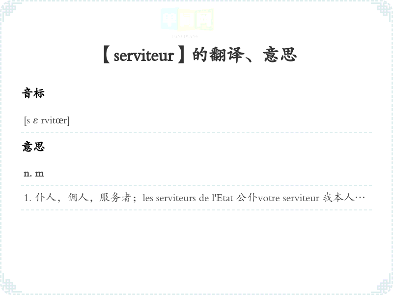 【serviteur】 助记:、 近义词:、 反义词: 联想词