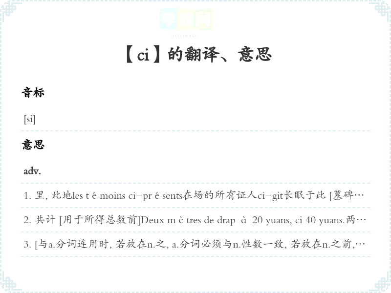 loc.adv.对面, 旁边la page ci-contre旁la colonne ci-contre旁边一栏ci-devantloc.adv.〈古语,古义〉以前, 如前de-ci de-làloc.adv.到处par-ci par-làloc.adv.在里那里, 在有些地方;有时候quelques erreurs, par-ci par-là某些地方有一些错误pron.dém.〈口语〉个 [ceci 的缩写, 和 ça 一起用]demander ci et ça那Comment vous portez-vous?— Comme ci comme ça. 您好吗? —马马虎虎, 还可以。