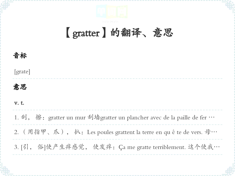 刮, 擦:gratter un mur 刮墙gratter un plancher avec de la paille de fer 用钢丝绒擦地板gratter ses chaussures 擦掉鞋底上泥gratter le palier [机]刮研轴承plume qui gratte (le papier) 钩纸张笔尖gratter le (du) papier 以写为生gratter la terre 浅耕; [引]耕