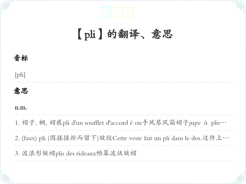 (faux) pli (因搓揉折而留下)皱纹Cette veste fait un pli dans le dos.这件上衣背上皱了。ne pas faire un pli (衣服)非常合身Cela ne fait [fera] pas un pli .〈转义〉〈口语〉这不成问题。这是十拿九稳。