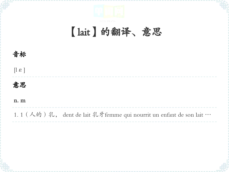 1(人的)乳, dent de lait 乳牙femme qui nourrit un enfant de son lait 母乳喂养孩子的妇女2(动物的)乳, lait complet (entier )全脂lait écrémé 脱脂lait frais 鲜3(某些植物的)乳状汁液; 乳状液lait de coco 椰子汁lait de ciment 水泥浆