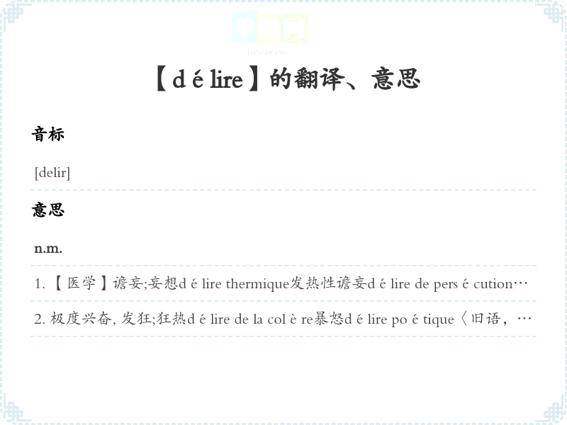极度兴奋, 发狂;狂热délire de la colère暴怒délire poétique〈旧语,旧义〉诗兴foule en délire 狂热人群
