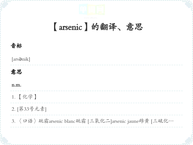 〈口语〉砒霜arsenic blanc砒霜 [三氧化二]arsenic jaune雌黄 [三硫化二]arsenic rouge雄黄 [二硫化二]