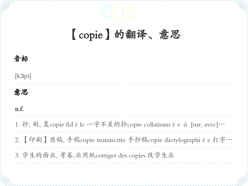 【copie】 词根:、 派生:、 名词变化:、 近义词:、 反义词: 联想词
