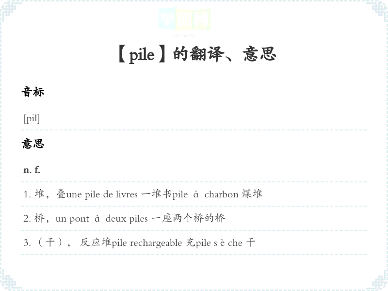 【pile】 联想:、 近义词:、 反义词: 联想词