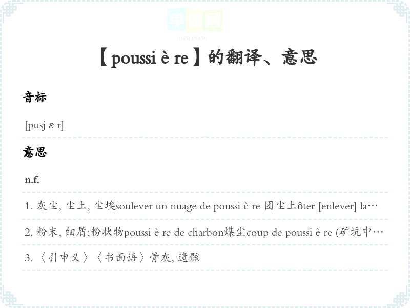 灰尘, 尘土, 尘埃soulever un nuage de poussière 团尘土ôter [enlever] la poussière 去掉灰尘sac à poussière de l'aspirateur吸尘器蓄尘袋avoir une poussière dans l'œil睛里有粒灰尘mordre la poussière 被打翻在地;被打死;〈转义〉遭到失败réduire en poussière 使成粉末;〈转义〉粉碎, 毁灭secouer la poussière de ses pieds [de ses sandales]〈转义〉永远离开