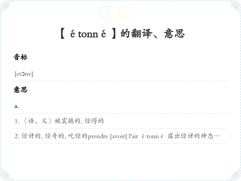 惊讶的, 惊奇的, 吃惊的prendre [avoir] l'air étonné 露出惊讶的神态être étonné de (+inf.)为某事而感到惊讶[用作n.]faire l'étonné 装出惊讶的样子