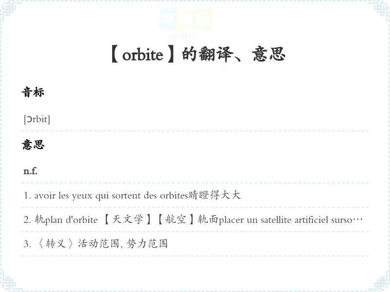 轨plan d'orbite 【天文学】【航空】轨面placer un satellite artificiel surson orbite 一颗人造卫星送入轨mise sur [en] orbite 送入轨les orbites des électrons【物理学】电子轨