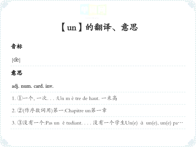 ③没有一个:Pas un étudiant. . . . 没有一个学生Un(e) à un(e), un(e) par un(e) 一个一个地, 逐个地adj.<书>统一的, 单一的, 合成一体的, 不能分割的: 书>La vérité est une. 真理只有一个。n. m. inv.