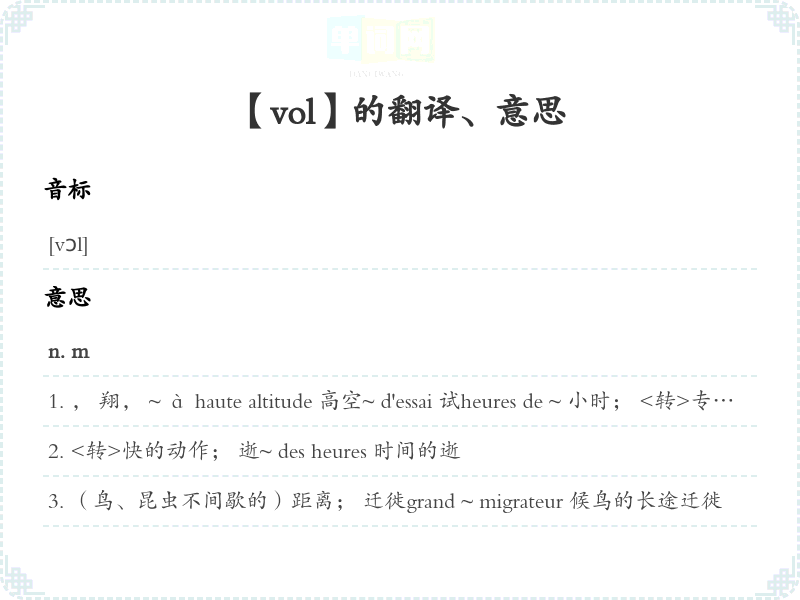 , 翔, ~ à haute altitude 高空~ d'essai 试heures de ~ 小时; <转>专业经验au ~ 中; 凌空, 空中; 快地en (plein) ~ 中de haut ~ 能高的; <转>达到很高程度的, 手段高明的prendre son ~ 起来, 起; <转>跃发展转>转>转>