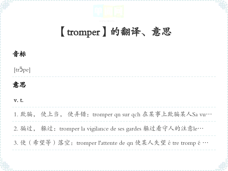 【tromper】 联想:、 名词变化:、 近义词:、 反义词: 联想词