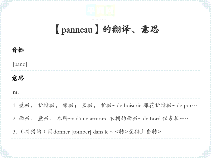 壁板, 护墙板, 镶板; 盖板, 护板~ de boiserie 雕花护墙板~ de porte 门心板