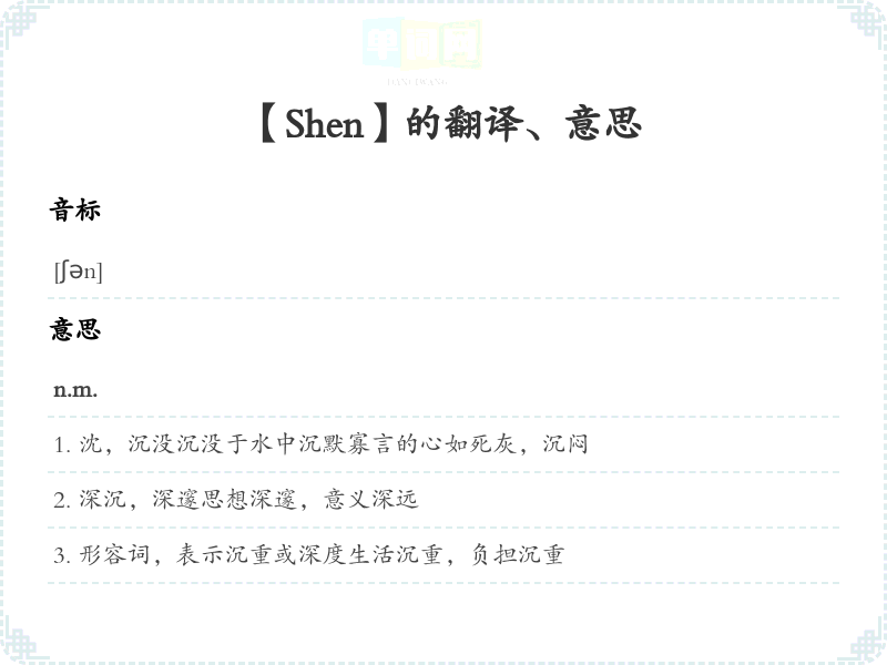 【Shen】 助记:、 词根:、 联想、 名词化:、 词化:、 形容词化:、 近义词、 反义词、 同音、近音词 联想词