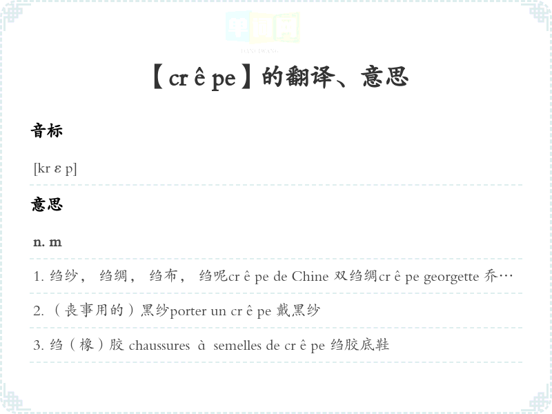 【crêpe】 联想、 动词变化:、 近义词、 同音、近音词 联想词