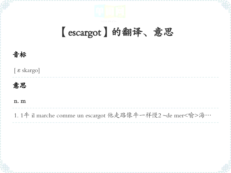 1牛 il marche comme un escargot 他走路像牛一样慢2 ~de mer<喻>海螺 3 escalier en~螺旋式楼梯喻>脑筋迟钝的人; 凸状涡形轮; 行动迟缓的人; 形凸轮