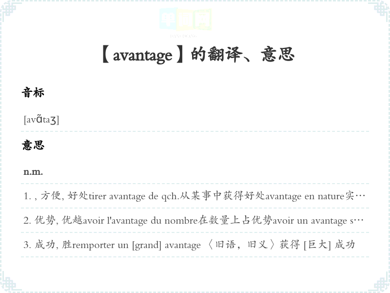 【avantage】 派生:、 近义词:、 反义词: 联想词
