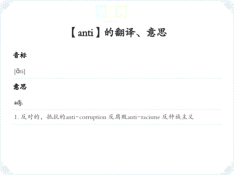 【anti】 助记:、 词根:、 联想、 名词化:、 词化:、 形容词化:、 近义词、 反义词、 同音、近音词 联想词