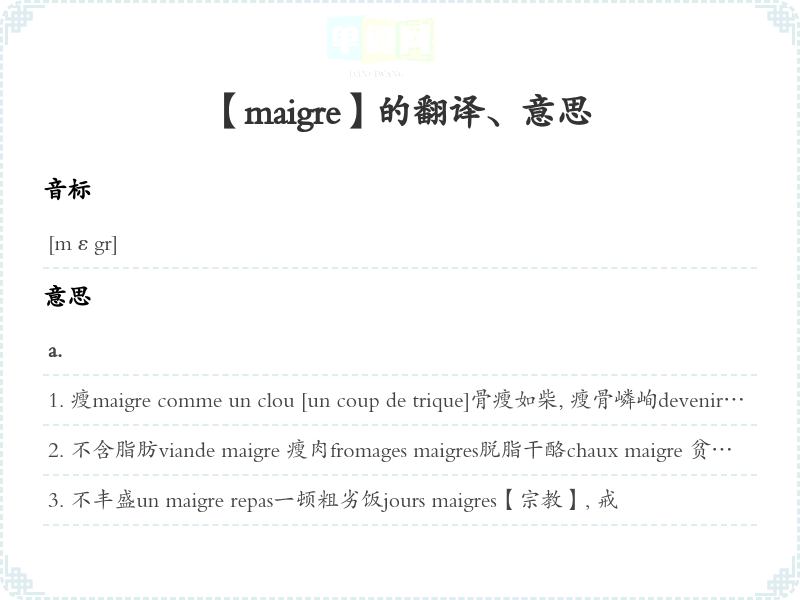 【maigre】 联想:、 近义词:、 反义词: 联想词