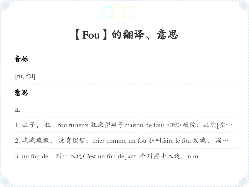 失去理智,愚蠢, 傻fou de joie 欣喜若狂un fol espoir 失去理智希望être fou de... 发疯般地爱上…,狂热地迷恋…,对…入迷Il est un peu fou. 个有点不正常,有点怪。