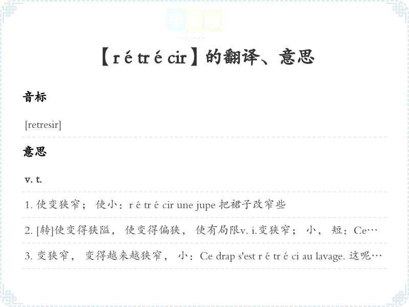 【rétrécir】 助记:、 近义词:、 反义词: 联想词