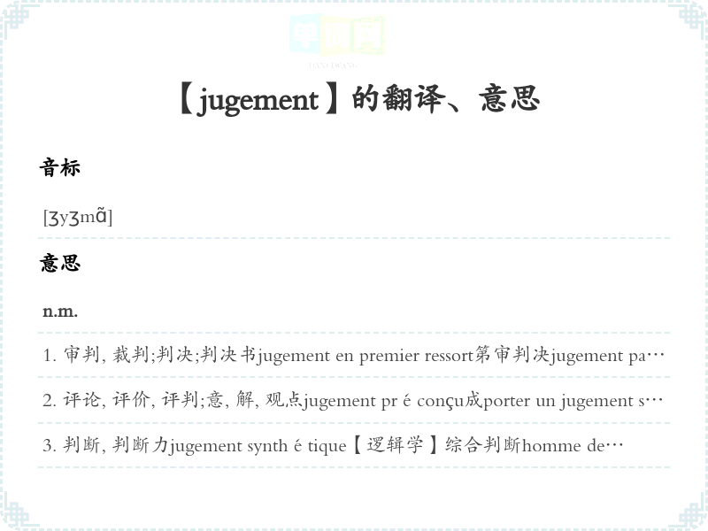 审判, 裁判;判决;判决书jugement en premier ressort第审判决jugement par défaut缺席判决jugement de Dieu天命, 天意;(中世纪)神意裁判法jugement (dernier)【宗教】最后的审判minute de jugement 判决书原本casser un jugement 撤销原判faire appel d'un jugement 上诉mettre [poursuivre] qn en jugement 某人起诉, 起诉某人prononcer un jugement 宣读判决书rendre un jugement 判决, 宣告判决