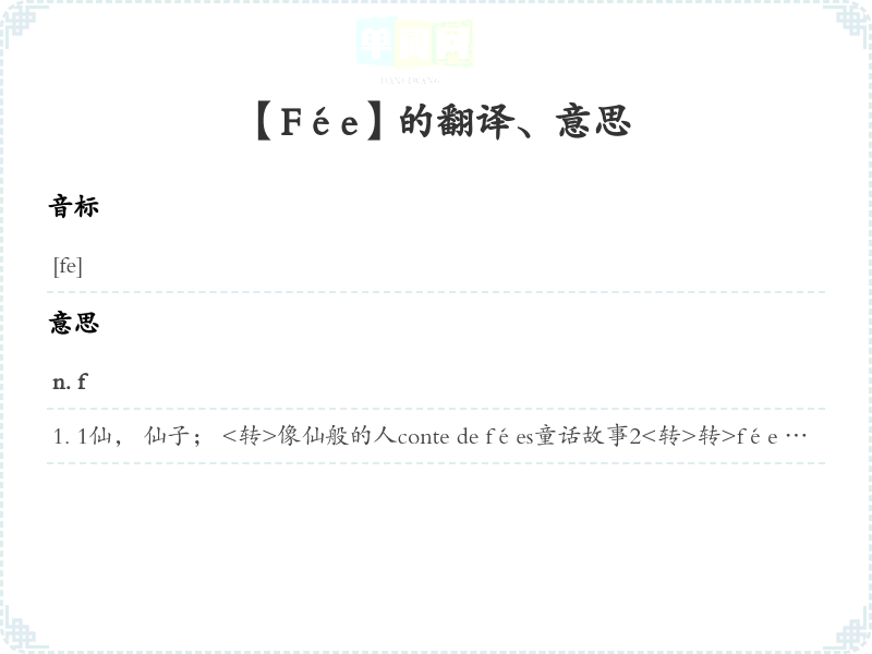 【Fée】 词源:、 近义词、 同音、近音词 联想词