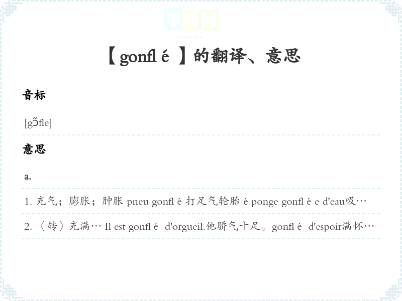 充气;膨胀;肿胀 pneu gonflé打足气轮胎éponge gonflée d'eau吸满水海绵les yeux gonflés哭肿眼睛être gonflé à bloc〈转,民〉干劲十足,信心百倍être gonflé毫顾忌,过分自信:Vous êtes gonflé de me raconter un pareil mensonge!您胆子够大,竟向我讲这样谎言!