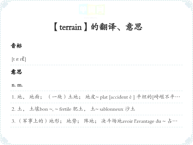 地, 地面; (一块)土地; 地皮~ plat [accidenté] 平坦的[崎岖不平的]地面occuper un vaste ~ 占据一大片土地niveler un ~ 平整一块地ménager le ~ 充分利用仅有的土地; <转>谨慎行事deux hectares de ~ 两公顷土地spéculation sur les ~s 地皮投机~ militaire 军用土地tous ~s, tout ~ 越野的[指车辆]转>