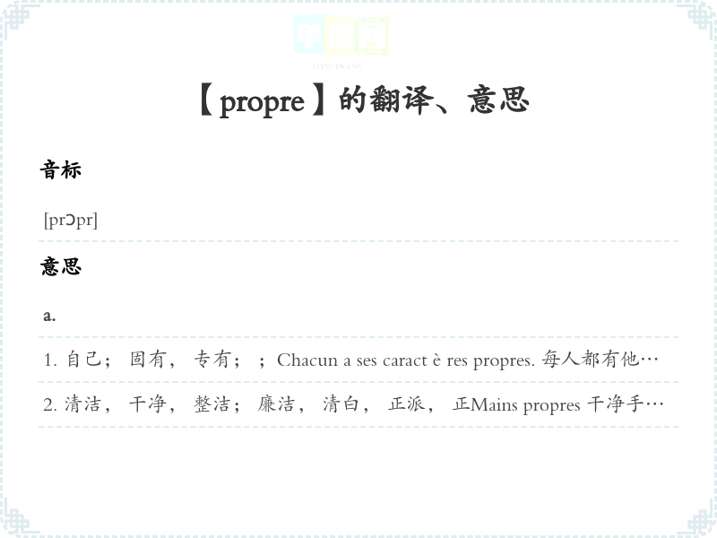清洁, 干净, 整洁; 廉洁, 清白, 正派, 正Mains propres 干净手Son passé n'est pas très propre. 他历史不太清白。m.1特性; 本义Le rire est le propre de l'homme. 笑是人本性。2 pl. (夫妻各人)私有财产3 en propre 本人自有,已有elle possède cette maison en propre 这幢房子是她自己