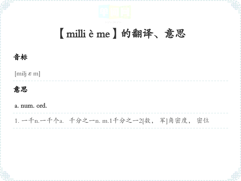 一千n.一千个a.千分之一n. m.1千分之一2[数, 军]角密度, 密位