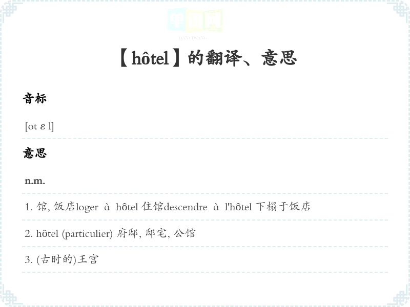【hôtel】 联:、 名词变化:、 形容词变化:、 近义词: 联词