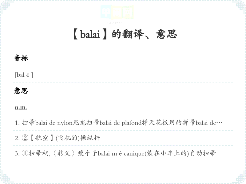 扫帚balai de nylon尼龙扫帚balai de plafond掸天花板用的掸帚balai de chiottes〈口语〉马桶刷子passer le balai 打扫donner un coup de balai à une pièce把房间很快地打扫一下coup de balai 〈转义〉裁员, 解雇Du balai !〈口语〉!manche à balai