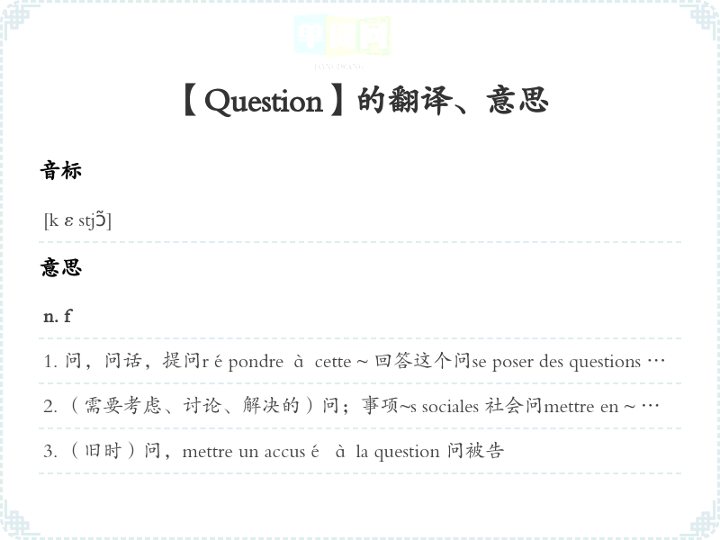 (需要考虑、讨论、解决的)问;事项~s sociales 社会问mettre en ~ 对...提出疑问en ~ 提到的Le projet en question est intéressant pour nous. 我们对提到的草案感兴趣。Il n'en est pas ~. 绝对不行。Là est toute la question. 全部问就在这里。