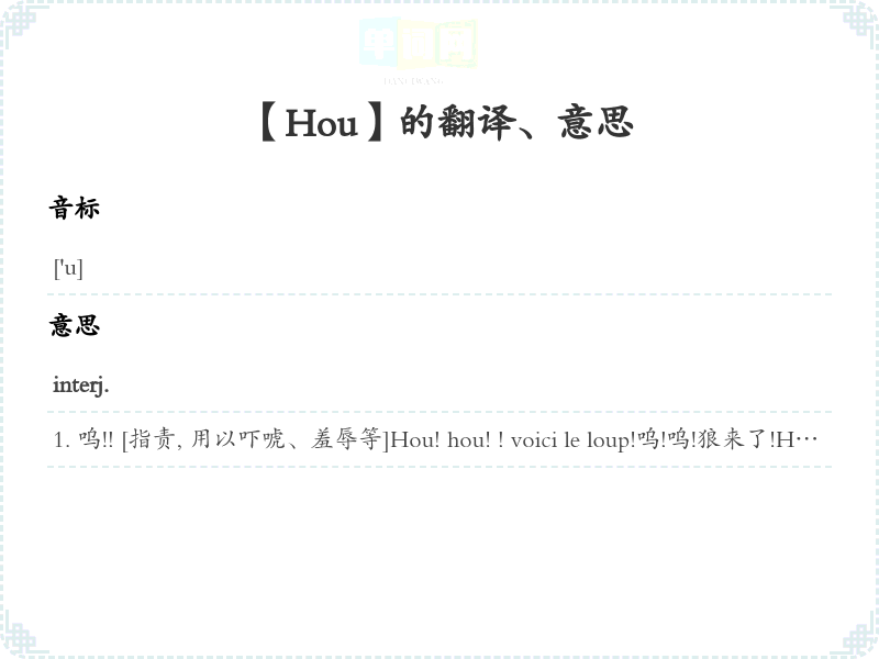呜!! [指责, 用以吓唬、羞辱等]Hou! hou! ! voici le loup!呜!呜!狼来了!Hou! hou! ! à la porte!!!滚去!