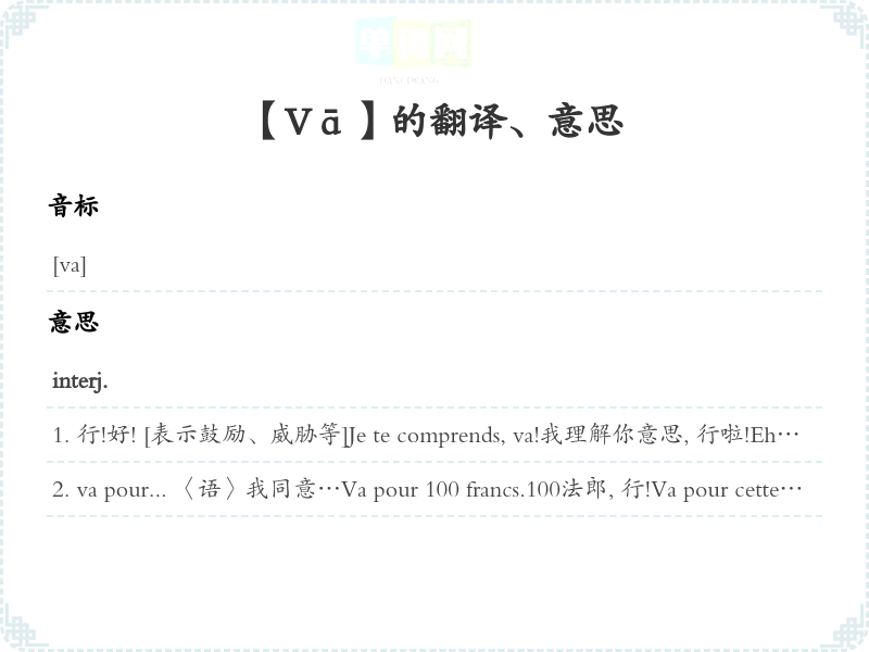 行!好! [表示鼓励、威胁等]Je te comprends, va!我理解你意思, 行啦!Eh bien, va.那么, 好吧。Va donc!〈俗语〉去你!
