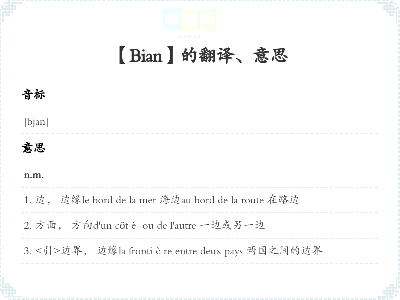 【Bian】 助记:、 词根:、 联想、 名词化:、 词化:、 形容词化:、 近义词、 反义词、 同音、近音词 联想词