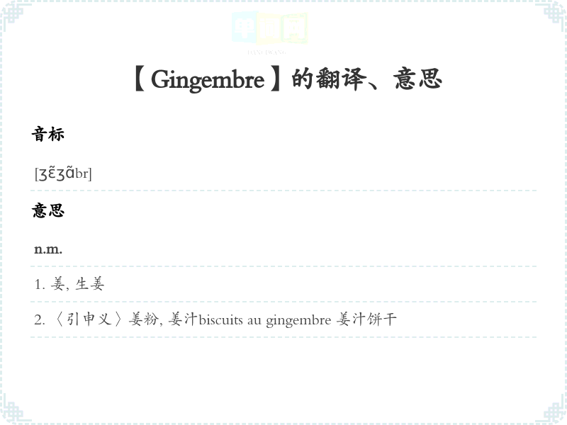 〈引申义〉姜粉, 姜汁biscuits au gingembre 姜汁饼干