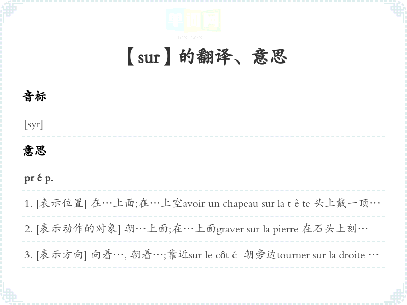 [表示方向] 向着…, 朝着…;靠近sur le côté 朝旁边tourner sur la droite 向右转Il a deux fenêtres sur la rue. 他的房子有两扇朝街的窗。marcher sur les pas de qn 跟着某人的脚revenir sur Paris 巴黎fermer la porte sur soi 随手关门Elle allait sur ses vingt ans.〈比喻〉她快20岁了。ville sur le Yangtsé 长江边上的城市