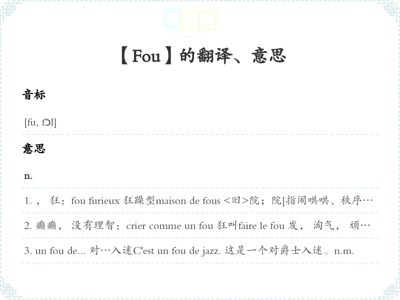 失去理智,愚蠢, 傻fou de joie 欣喜若狂un fol espoir 失去理智希望être fou de... 发般地爱上…,狂热地迷恋…,对…入迷Il est un peu fou. 这个有点不正常,有点怪。