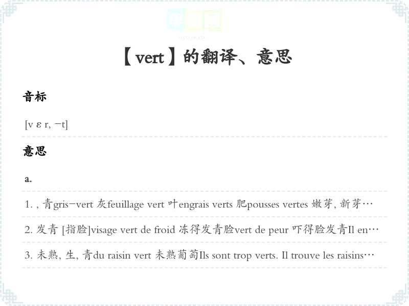 〈比喻〉未加工, 未经处理, 还不能使用café vert 生咖啡cuir vert 【制革】血皮, 湿皮vin vert 未酿熟尚带酸味酒morue verte 腌鳕鱼