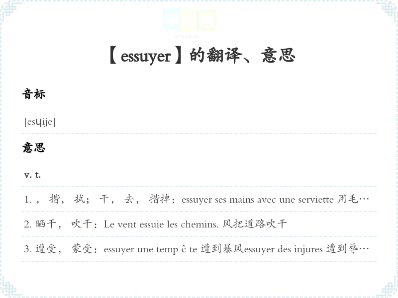 , 揩, 拭; 干, 去, 揩掉:essuyer ses mains avec une serviette 用毛巾把手干essuyer ses pieds (在鞋上)把鞋底干净essuyer des meubles 把家具揩干净essuyer l'eau qui a coulé sur la table 把流在桌上的水掉essuyer les larmes de qn 干某人的眼泪; [转]安慰某人essuyer les plâtres, essuyer les murs [转, 俗](1)搬进新屋(2)(初次尝试者)吃亏, 倒霉