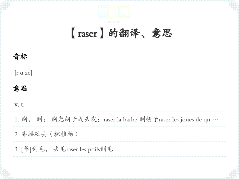 剃, 刮; 剃光胡子或头发:raser la barbe 刮胡子raser les joues de qn 给某人修面raser la tête de qn 给某人剃头raser qn 给某人剃掉胡子或头发se faire raser chez un coiffeur 到理发店去剃胡子或头发