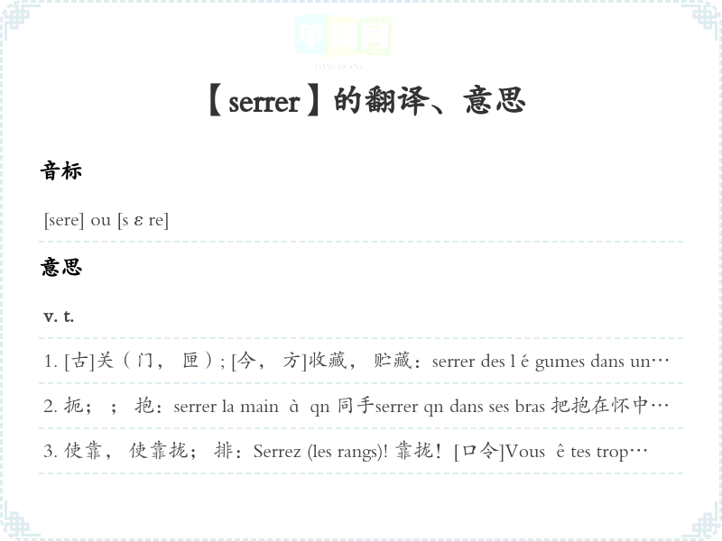 【serrer】 助记:、 词:、 派生:、 联想:、 名词变化:、 形容词变化:、 近义词:、 反义词: 联想词