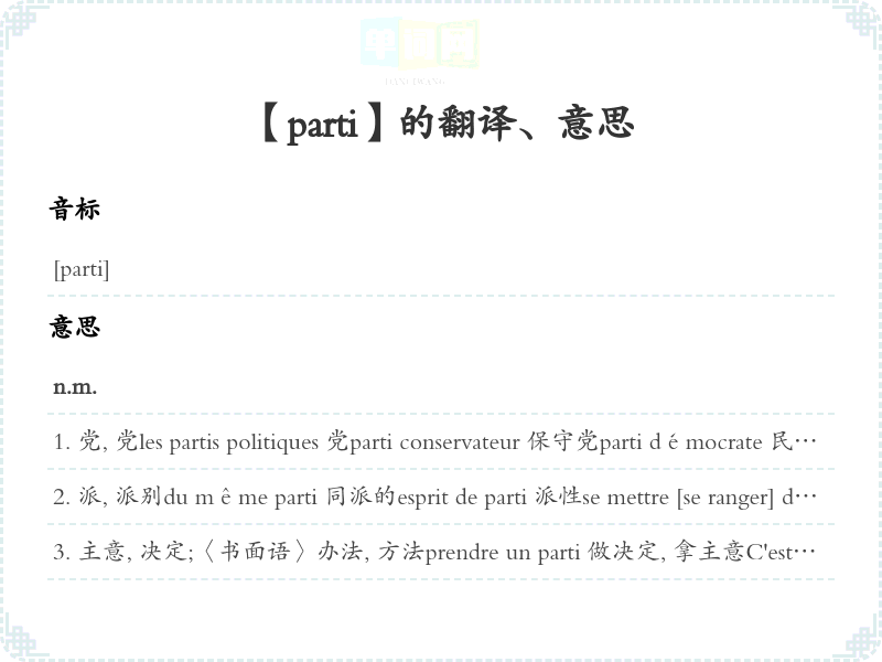 主意, 决定;〈书面语〉办法, 方法prendre un parti 做决定, 拿主意C'est là le meilleur parti. 这办法最好。prendre parti 表态prendre le parti de (+ inf.) 决定(做某事)prendre son parti 打定主意;死了心prendre son parti de qch. 容忍某事, 对某事逆来顺受parti pris