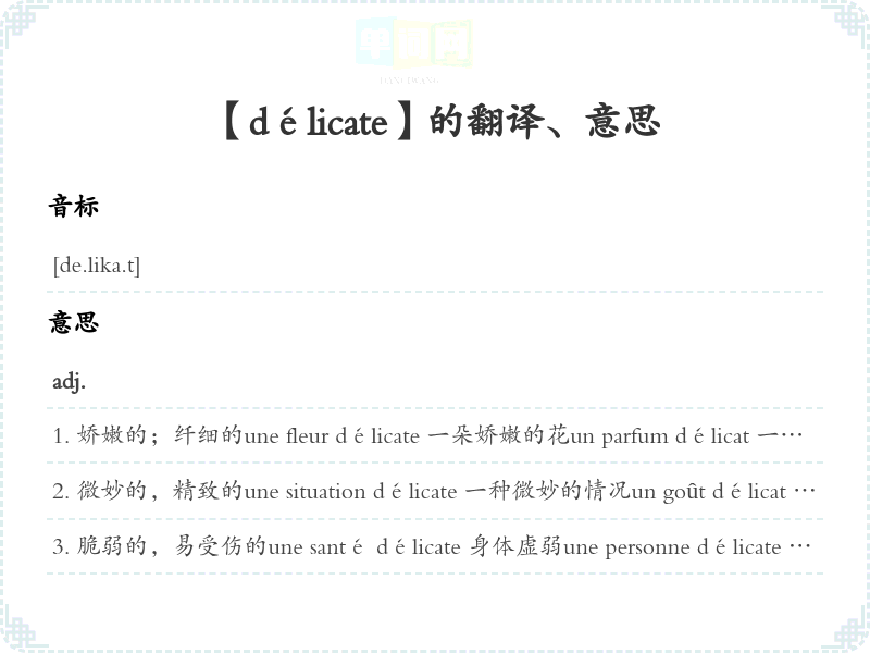 微妙的,精致的une situation délicate 一种微妙的情况un goût délicat 一种细腻的味道