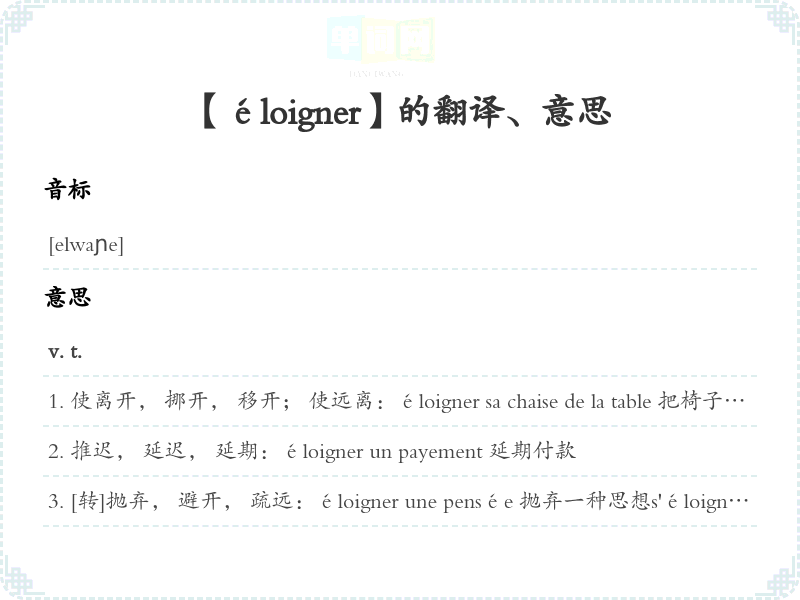 使离开, 挪开, 移开; 使远离:éloigner sa chaise de la table 把椅子从桌旁移开Chaque jour qui passe nous éloigne de notre jeunesse. 日复一日,我们离青春越来越远了。